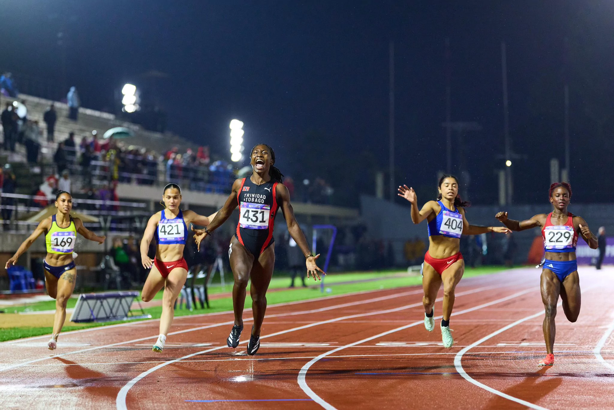 “With the flag of Trinidad and Tobago in my heart… and on my feet,” Bascombe said emotionally after crossing the finish line, making it clear that her speed is pure national pride.