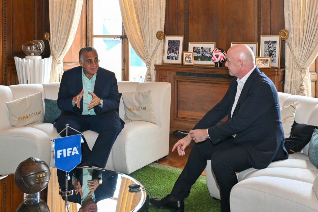 PARIS, FRANCE – AUGUST 07: FIFA President Gianni Infantino speaks with President of Dominican Republic Olympic Committee Luis Mejia Oviedo during a meeting with the President of Dominican Republic Olympic Committee at FIFA’s Paris office on August 07, 2024 in Paris, France. (Photo by Harold Cunningham/FIFA)