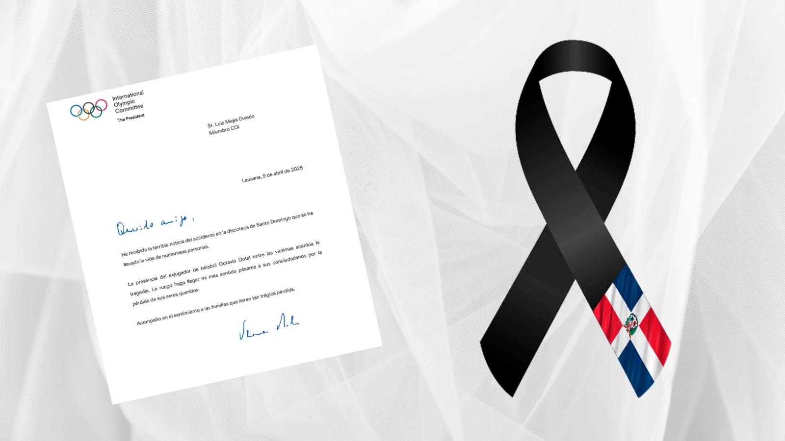 El Dr. Thomas Bach expreso sus palabras de solidaridad en nombre del Comité Olímpico Internacional al pueblo dominicano. En comunicación enviada al miembro IOC y Presidente de Centro Caribe Sports Luis Mejia Oviedo, expreso sus condolencias ante la lamentable tragedia acaecida en Santo Domingo, Capital de Republica Dominicana.